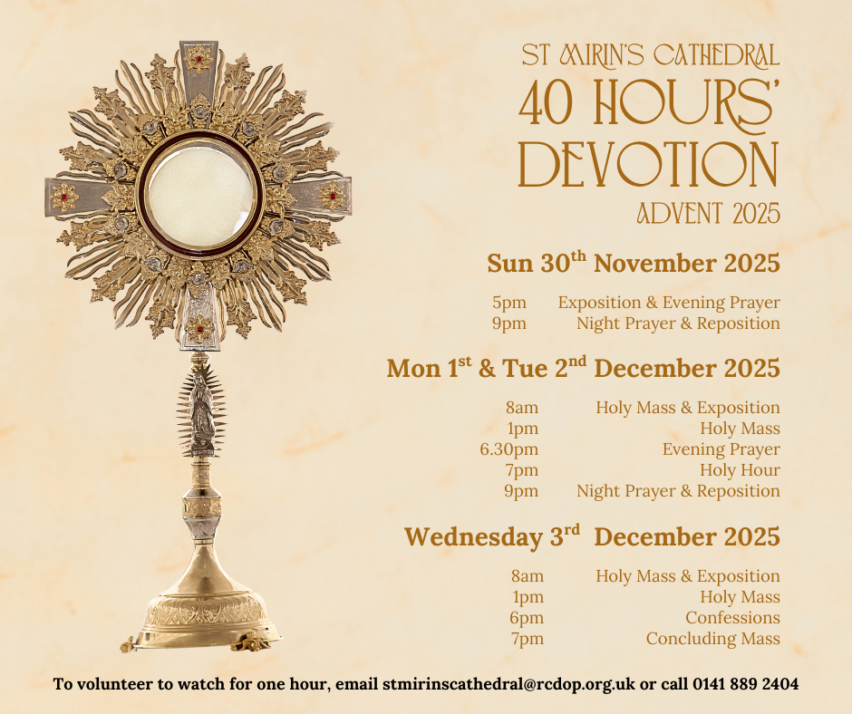 To volunteer to watch for an hour (or more) during the 2025 40 Hours' devotion at St Mirin's Cathedral, please complete the form below.